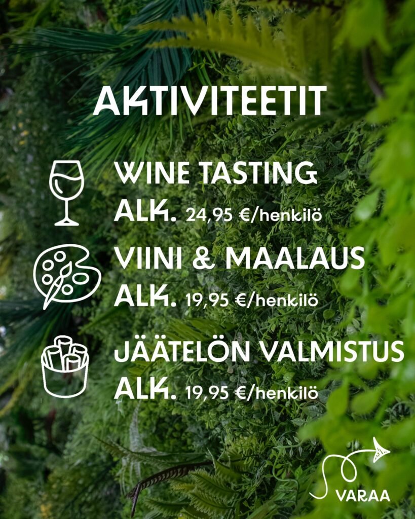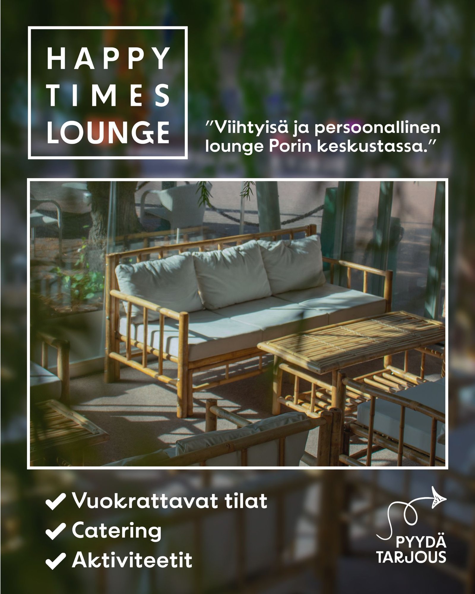 Paikan voi varata myös yksityistilaisuuksia varten lähettämällä viestin osoitteeseen info@happytimes.fi tai soittamalla +358 50 5522 884. Pyrimme mahdollisuuksien mukaan toteuttamaan toiveesi onnistunutta tapahtumaa varten. Istumapaikkoja on sisätiloissa enintään 40 ja ulkoterassilla enintään 200.